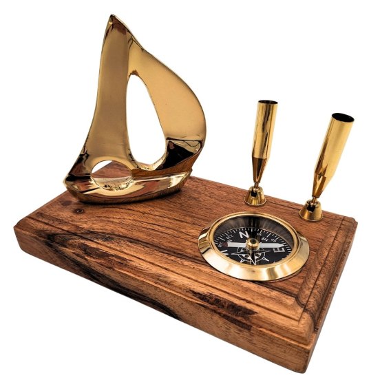 Zestaw na biurko z modelem jachtu i kompasem na drewnianej podstawie to wyjątkowa propozycja dla osób ceniących marynistyczny styl i klasyczny design. Wykonany z drewna i mosiądzu, przyciąga uwagę detalami i wysoką jakością wykończenia.