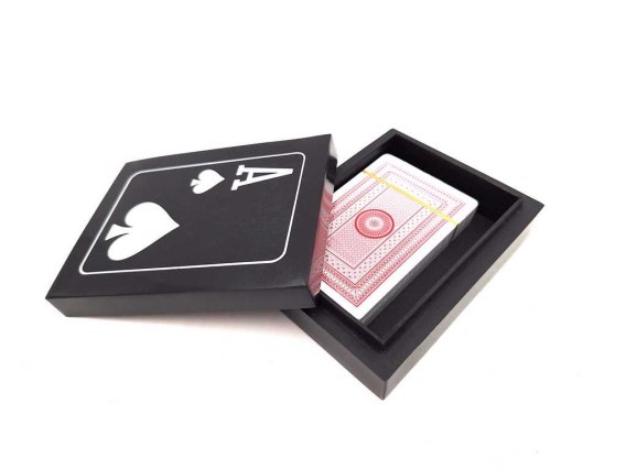 Eleganckie pudełko z kartami może stać się niebanalną ozdobą biurka, regału lub stołu. Czarna kolorystyka pudełka w połączeniu z symbolem asa pik idealnie sprawdzi się w nowoczesnych, minimalistycznych wnętrzach.