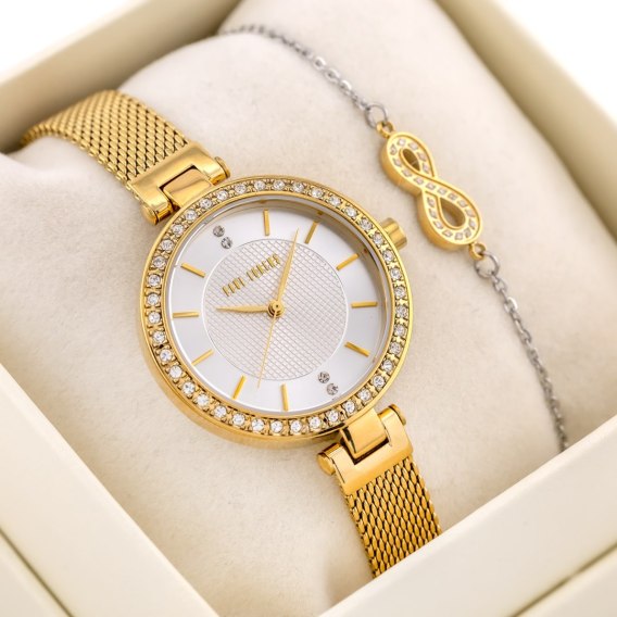 Komplet prezentowy damski, który zachwyca swoją elegancją i ponadczasowym stylem. Zawiera zegarek ze stali szlachetnej marki Paul Lorens w kolorze złotym, z piękną tarczą w kolorze srebrnym, która subtelnie podkreśla jego klasyczny charakter. Złota koperta zegarka zdobiona kryształkami, dodaje całości wyjątkowego blasku. Zegarek charakteryzuje się także wodoszczelnością WR30, co sprawia, że jest praktyczny i funkcjonalny. Do kompletu dołączona jest elegancka bransoletka w kolorze srebrnym ze złotym znakiem nieskończoności, która perfekcyjnie komponuje się z zegarkiem. To idealny wybór na prezent - elegancki, piękny i niezapomniany.