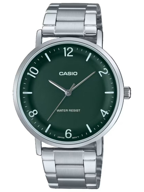 Zegarek męski CASIO MTP-VT03D-3B to połączenie klasycznej elegancji i nowoczesnej funkcjonalności, które sprawia, że każdy mężczyzna poczuje się wyjątkowo. Ten model to prawdziwy hołd dla minimalistycznego designu - jego okrągła, zielona tarcza z subtelnymi srebrnymi wskazówkami i indeksami emanuje spokojem i wyrafinowaniem. Delikatna srebrna koperta dodaje mu odrobiny luksusu, czyniąc go idealnym dodatkiem zarówno do garnituru, jak i casualowych stylizacji. To zegarek, który nie tylko pokazuje czas, ale także opowiada historię Twojego dobrego gustu.