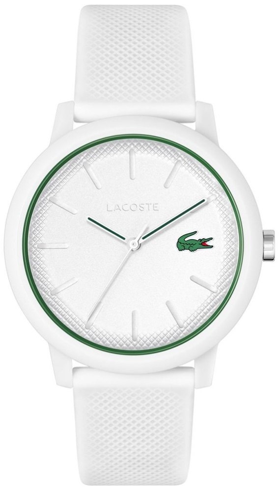 Model utrzymany w minimalistycznej bieli, to propozycja dla mężczyzn ceniących styl i designerskie dodatki. Matowa, biała tarcza została wzbogacona o delikatną teksturę na obrzeżach oraz subtelne, białe indeksy, co dodaje zegarkowi głębi, nie odciągając uwagi od jego estetycznego minimalizmu. Charakterystycznym akcentem tego modelu jest zielony krokodyl Lacoste, umieszczony na godzinie 3, który dodaje całości świeżości i podkreśla sportowy, dynamiczny charakter marki. Zielone wskazówki sekundnika oraz otaczający tarczę delikatny zielony pierścień idealnie kontrastują z bielą, nadając zegarkowi unikalny wygląd. Całość dopełnia pasek wykonany jest z lekkiego, wytrzymałego silikonu, z wizerunkiem krokodyla na końcu paska.